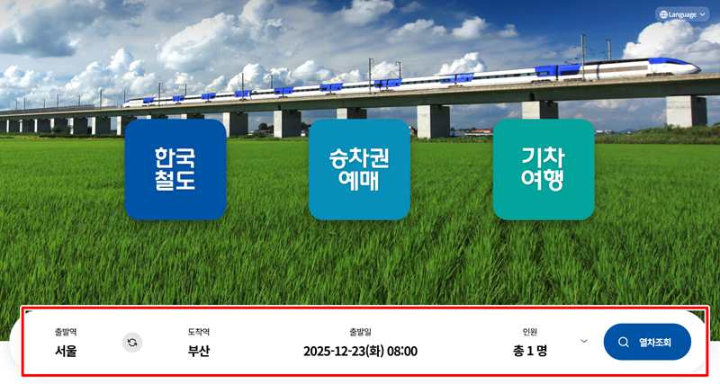 1. KTX 예매의 첫걸음은 한국철도공사(코레일) 홈페이지에 접속하는 것입니다. 메인 화면의 승차권 예매 창에서 출발역과 도착역, 출발일, 탑승 인원을 차례대로 선택한 후 '열차 조회'를 눌러주세요.