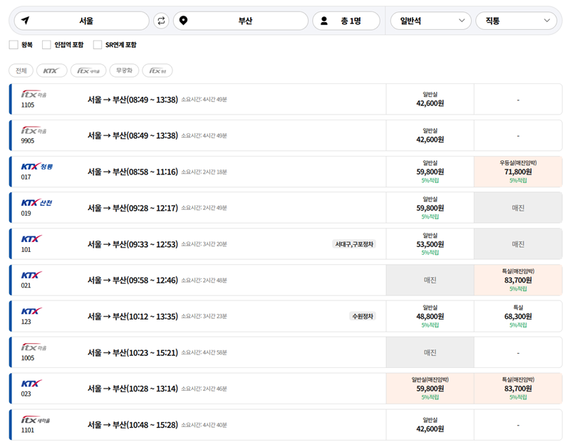 3. 원하는 시간대의 열차를 골랐다면, 일반실이나 특실 중 원하는 좌석의 요금을 확인하고 '예매'를 선택하여 다음 단계로 진행합니다. 이 과정에서 적용되는 할인 혜택이 있다면 함께 표시되니 꼼꼼히 살펴보는 것이 좋습니다.