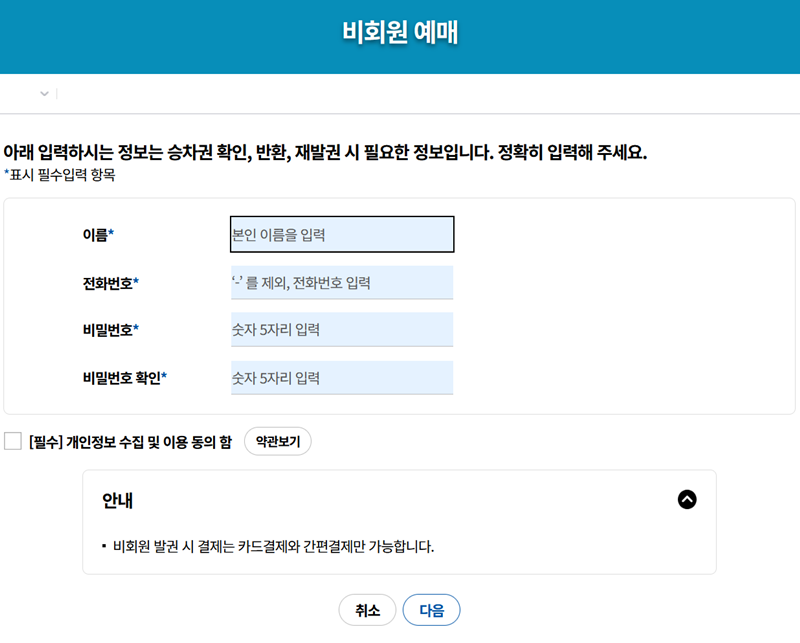 5. 비회원 예매를 선택하면 정보를 입력하는 화면이 나옵니다. 이름과 전화번호를 정확히 기입하고, 추후 예약 내용을 확인하거나 변경할 때 사용할 5자리 숫자 비밀번호를 설정한 후 개인정보 수집에 동의해주세요.