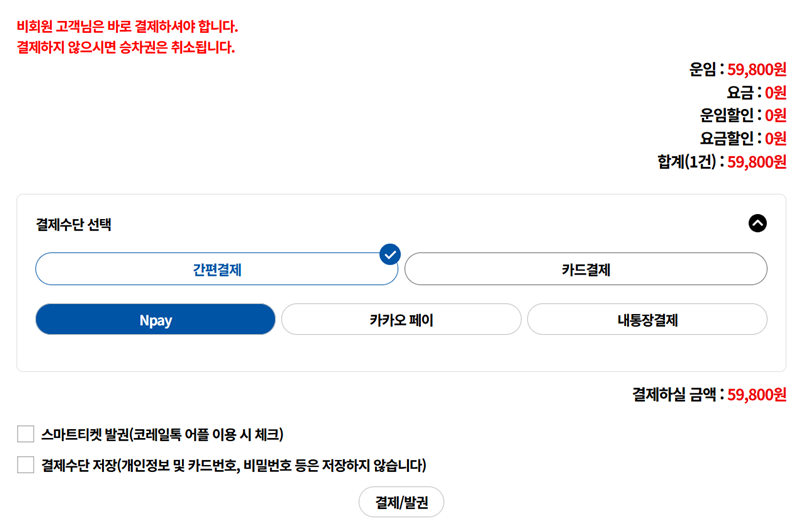 6. 예매 정보 입력을 마치면 결제 단계로 넘어갑니다. 비회원 예매 시에는 간편결제와 카드결제 중에서 선택할 수 있습니다. 원하는 결제 방식을 고르고 '결제/발권'을 눌러 모든 예매 절차를 마무리합니다.