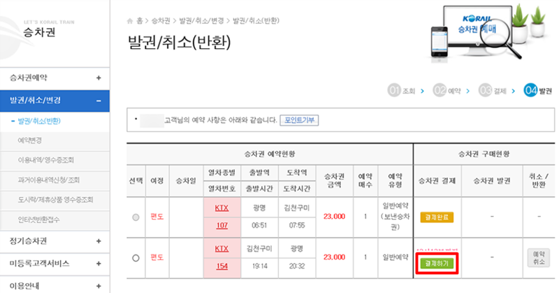 7. 결제가 성공적으로 완료되면 승차권이 발권됩니다. 만약 예매 후 바로 결제하지 않았다면, 정해진 시간 내에 예약 내역을 다시 확인하고 '결제하기'를 통해 결제를 마쳐야 최종적으로 승차권이 확보됩니다.