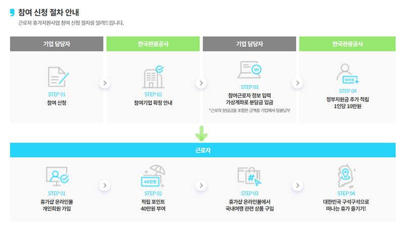 2. 참여 절차는 기업 담당자가 참여 신청을 하는 것부터 시작됩니다. 이후 한국관광공사에서 참여 기업을 확정하면, 기업이 근로자 분담금을 포함한 금액을 지정된 가상계좌로 입금합니다. 그러면 정부지원금 10만 원이 추가로 적립되어 근로자가 사용할 수 있게 됩니다.