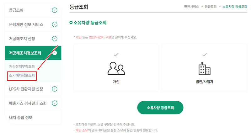 4. 조기폐차 대상 여부를 조회하려면 홈페이지 왼쪽 메뉴에서 '저공해조치정보조회'를 찾은 뒤, 그 아래에 있는 '조기폐차정보조회' 항목으로 이동해야 합니다.