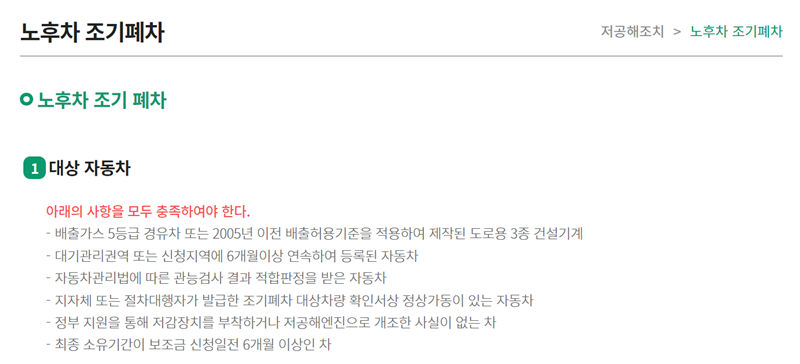 1. 조기폐차 대상이 되려면 배출가스 5등급 경유차이거나 2005년 이전 배출허용기준으로 제작된 도로용 3종 건설기계여야 합니다. 또한, 대기관리권역에 6개월 이상 연속하여 등록되어 있고 최종 소유 기간이 6개월 이상인 등 여러 조건을 모두 충족해야 합니다.