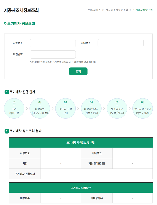 5. 조기폐차 정보조회 페이지에서는 차량번호와 확인번호를 입력하여 대상 여부를 바로 확인할 수 있습니다. 조회를 하면 신청 절차의 진행 단계와 함께 차량 정보 및 대상 여부가 결과로 나타납니다.