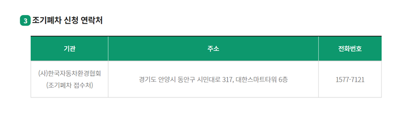 6. 조회 결과 페이지 하단에서는 조기폐차 신청을 실제로 접수하는 기관의 연락처와 주소 정보를 확인할 수 있습니다. 궁금한 점이 있거나 신청을 원할 경우 안내된 연락처로 문의하면 됩니다.