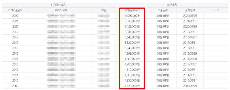 4. 검색 결과는 연도별로 정리된 표 형태로 나타납니다. 해당 토지의 과거부터 가장 최근까지의 개별 공시지가(원/㎡) 변동 내역을 한눈에 확인할 수 있어 가격 추이를 파악하는 데 도움이 됩니다.
