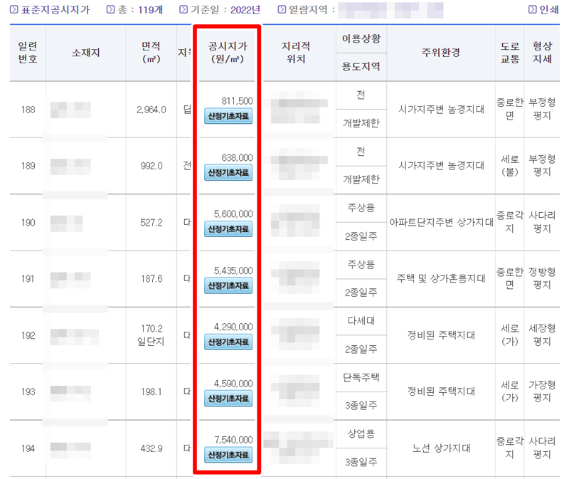 6. 검색을 마치면 선택한 지역에 위치한 표준지들의 목록이 나타납니다. 각 표준지의 단위 면적(㎡)당 공시지가와 함께 토지의 이용 상황, 주변 환경 등 상세한 정보까지 함께 확인할 수 있습니다.