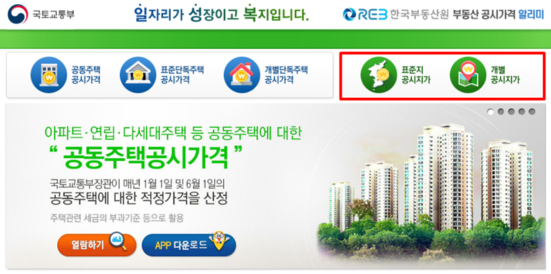 1. 홈페이지에 접속하면 공동주택, 단독주택 공시가격과 함께 토지 공시지가를 확인할 수 있는 항목들이 보입니다. 여기서 특정 필지의 가격을 알아보는 '개별 공시지가'와 주변 시세의 기준이 되는 '표준지 공시지가' 중 원하는 항목을 선택합니다.