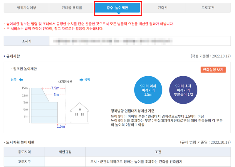 8. 마지막으로 '층수·높이제한' 탭을 통해 건축 가능한 건물의 최대 높이나 층수에 대한 규제 사항을 파악할 수 있습니다. 일조권 등 관련 규제도 함께 안내됩니다.