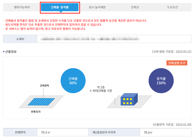 7. 바로 옆의 '건폐율·용적률' 탭에서는 해당 필지에 적용되는 건축물의 최대 바닥 면적과 연면적 비율을 확인할 수 있습니다. 그래픽으로 시각화되어 있어 이해하기 쉽습니다.