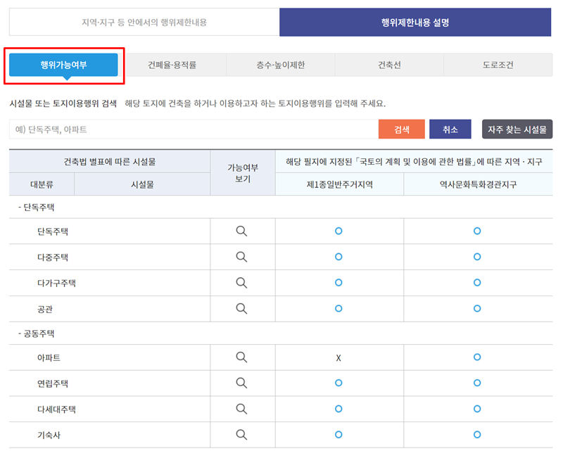 6. 다시 열람 화면으로 돌아와 상단의 '행위제한내용' 탭을 살펴보면, 해당 토지에서 가능한 건축 행위를 확인할 수 있습니다. 단독주택, 아파트 등 시설물 종류별로 건축 가능 여부가 표시됩니다.