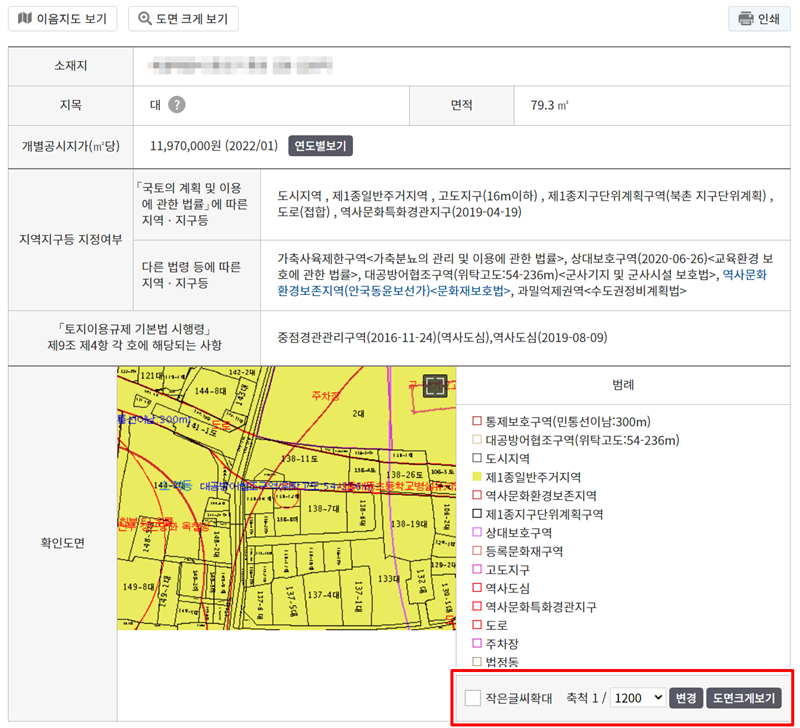 5. 크게 본 도면에서는 축척을 조절하여 더 넓은 범위를 보거나 상세하게 확대할 수 있습니다. 필요하다면 우측의 '인쇄' 기능을 이용해 해당 도면을 종이로 출력하는 것도 가능합니다.