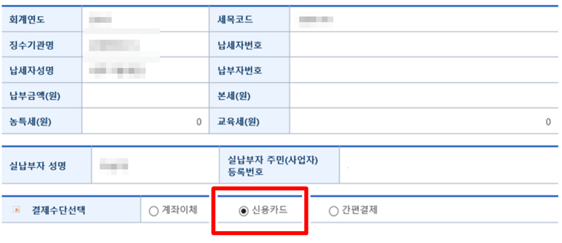 5. 납부 상세내역 화면으로 이동하면 결제수단을 선택하는 항목을 볼 수 있습니다. 여러 가지 방법 중 우리는 신용카드로 납부할 것이므로 '신용카드' 옵션을 선택하여 다음 과정을 준비합니다.