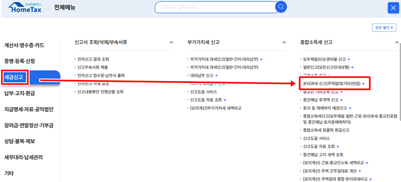 6. 전체메뉴 화면이 나타나면, 왼쪽의 여러 항목 중에서 '세금신고'를 선택합니다. 이어서 오른쪽에 보이는 다양한 세금 종류 중 '종합소득세 신고' 섹션 아래의 '분리과세 주택임대(기타/연금)' 항목으로 들어가면 신고 절차가 시작됩니다.