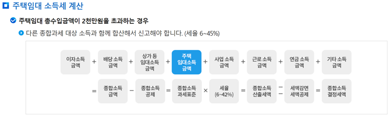 3. 만약 연간 주택임대 총수입금액이 2천만 원을 초과한다면, 다른 종합과세 대상 소득(이자, 사업, 근로소득 등)과 모두 합산하여 종합소득세율(6~45%)에 따라 신고하고 납부해야 합니다. 이는 다른 소득이 많은 경우 세금 부담이 커질 수 있는 구조입니다.