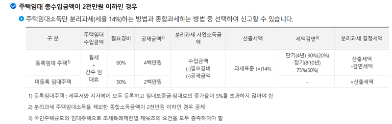 4. 반면, 연간 주택임대 총수입금액이 2천만 원 이하라면 선택권이 주어집니다. 다른 소득과 합산하여 신고하는 '종합과세' 방식과, 주택임대소득만 따로 14%의 세율로 계산하는 '분리과세' 방식 중 본인에게 더 유리한 쪽을 선택하여 신고할 수 있습니다.