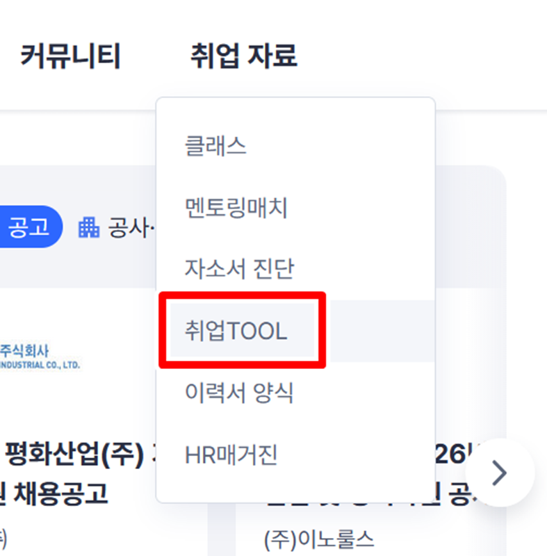 2. '취업 자료'에 마우스를 올리면 여러 하위 메뉴가 나타납니다. 그중에서 '취업TOOL'을 선택하면 취업 준비에 유용한 여러가지 기능들을 모아둔 페이지로 이동합니다.